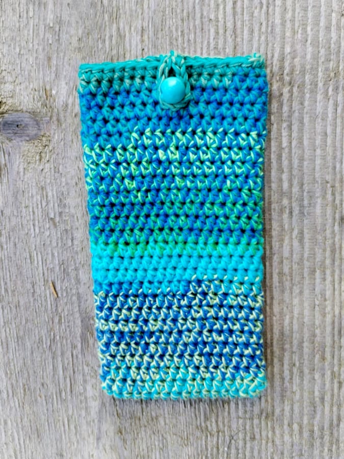 Etui melanżowe wykonane zostało na szydełku, z bawełnianych nici, które zostały z innych projektów, kolorach turkusu i niebieskiego. Zapinane na drewniany koralik. Nie ma podszewki.