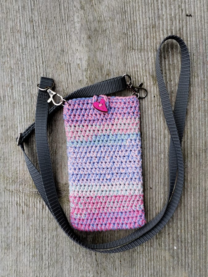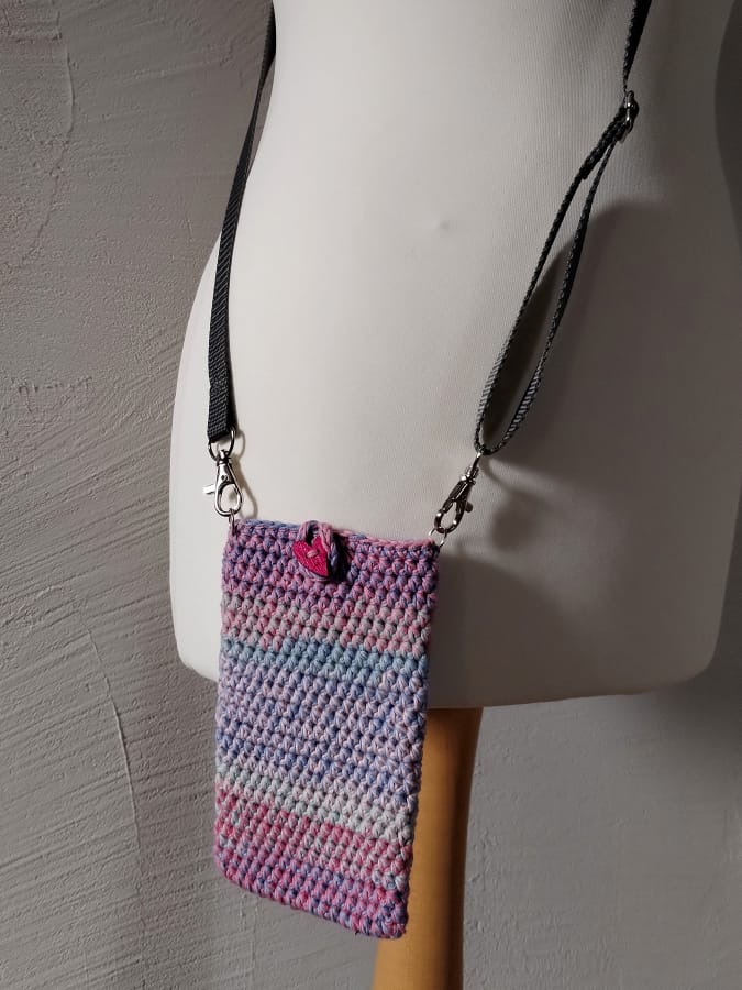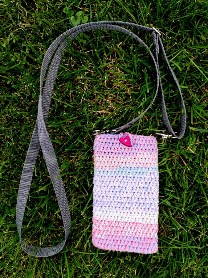 Etui wykonane zostało na szydełku, z bawełnianych nici, które zostały z innych projektów, w kolorach pastelowego różu, fioletu i niebieskiego. Zapinane na drewniany guzik – serduszko Nie ma podszewki.