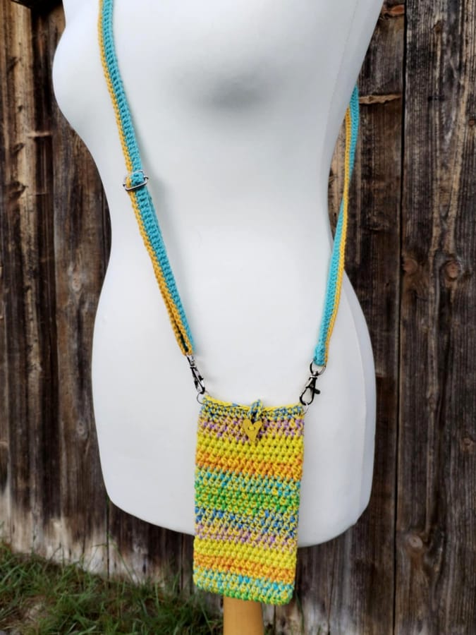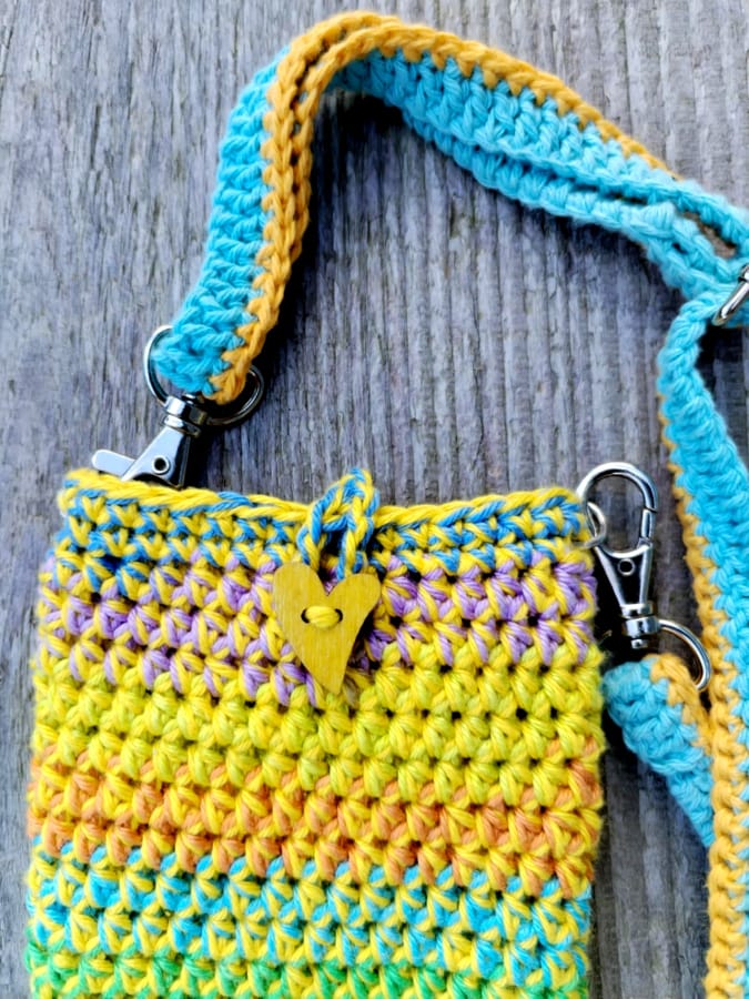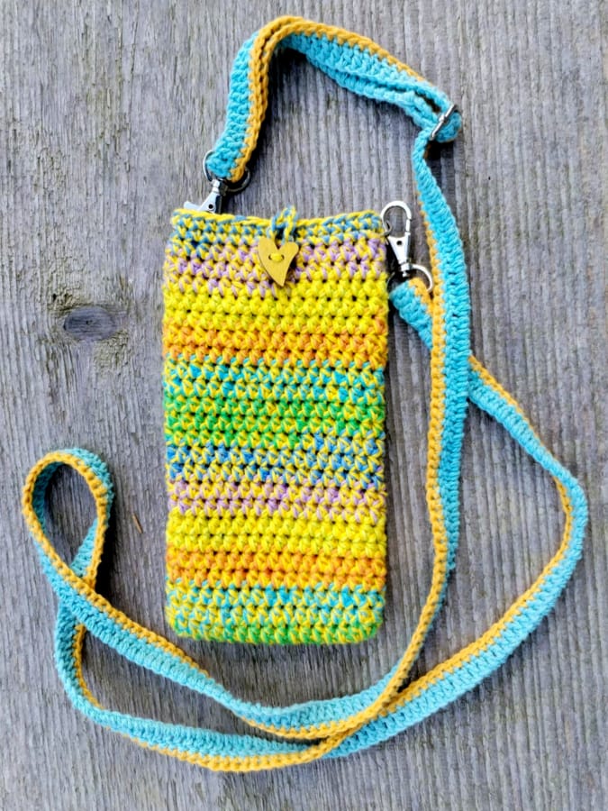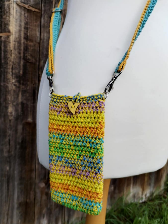 Etui melanżowe wykonane zostało na szydełku, z bawełnianych nici, które zostały z innych projektów, w kolorach tęczowych z nitką żółtą. Zapinane na drewniany guzik – serduszko Nie ma podszewki.