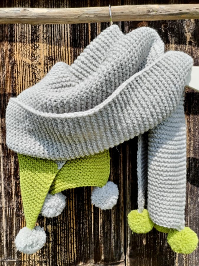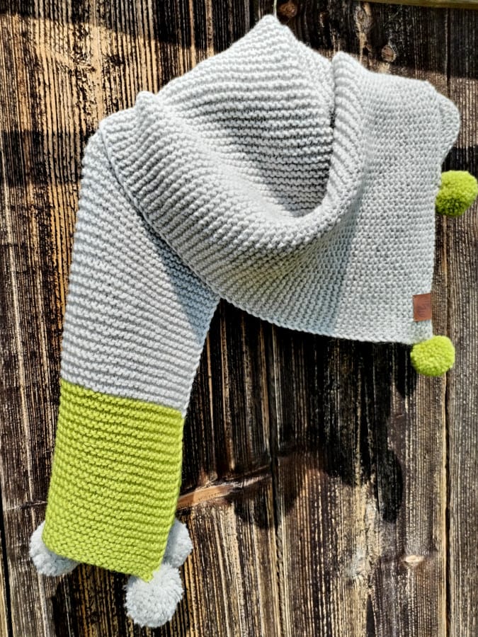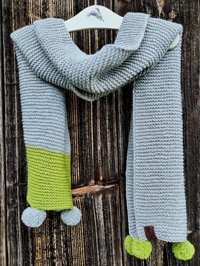 Stylowy szalik handmade wykonany na drutach z mieszanki wełny i akrylu. Jasnoszary z dekoracyjnym pasem limonkowej zieleni i uroczymi pomponami. Miękki, ciepły i idealny na chłodne dni.